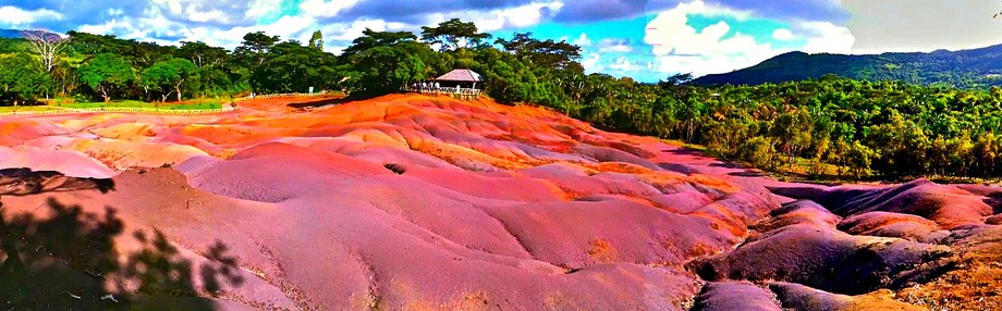 The Seven Coloured Earth are a geological formation and prominent tourist attraction found in the Chamarel plain, in the Black River District of south-western Mauritius. It is a relatively small area of sand dunes comprising sand of seven distinct colours (approximately red, brown, violet, green, blue, purple and yellow). The main feature of the place is that since these differently coloured sands spontaneously settle in different layers, dunes acquire a surrealistic, striped colouring. This phenomenon can also be observed, on a smaller scale, if one takes a handful of sands of different colours and mixes them together, as they’ll eventually separate into a layered spectrum. Another interesting feature of Chamarel’s Coloured Earths is that the dunes seemingly never erode, in spite of Mauritius’ torrential, tropical rains. The sands have formed from the decomposition of volcanic rock (basalt) gullies into clay, further transformed into ferralitic soil by total hydrolysis; the two main elements of the resulting soil, iron and aluminium, are responsible for red/anthracite and blue/purplish colours respectively.