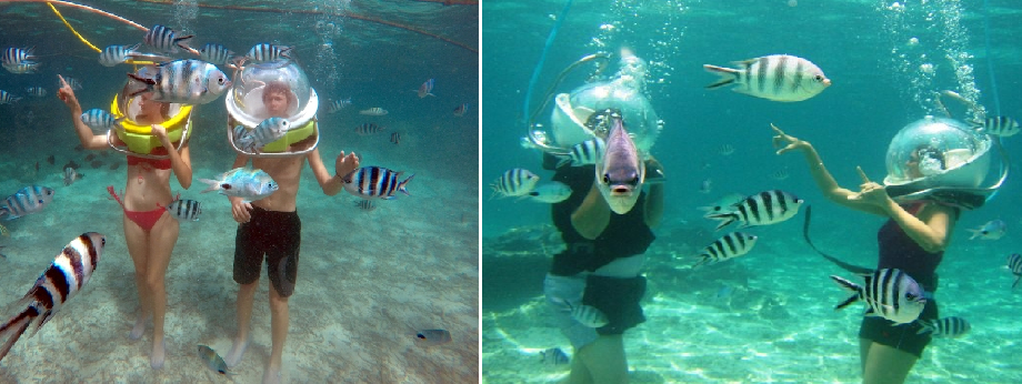 The undersea walk of 20 to 25 minutes takes place on the sandy bottom of the lagoon at average 3-metres depth. It operates from a platform moored inside the lagoon. You can wear glasses or contact lenses since your head remains dry. Before the undersea expedition, you are equipped with a designed diving helmet receiving compress air.